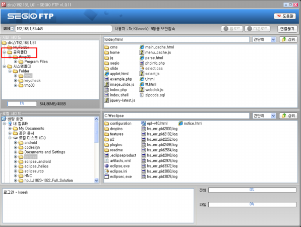 1) 프로토콜 부분을 클릭하여 접속할 프로토콜 종류를 선택할 수 있습니다 ( SEGIO, FTP, SFTP )