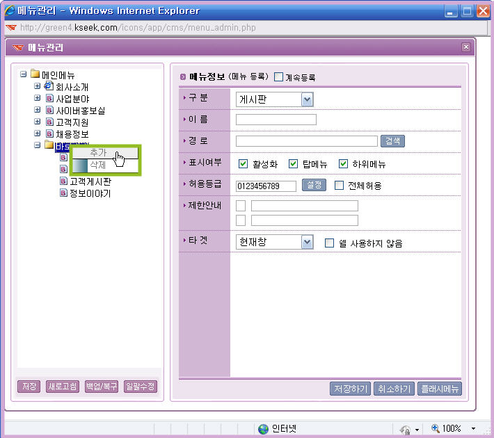 메뉴관리란 홈페이지  메뉴를 구성하는 대분류, 중분류, 소분류를 정하고, 각각의 이름/경로/표시여부/허용등급/제한/타겟 등의 사항을 설정하는 기능을 말합니다.